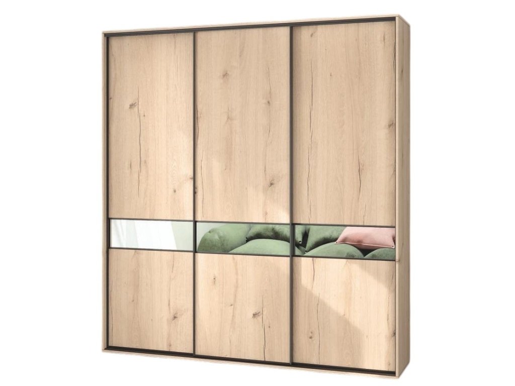 NENA je třídveřová šatní skříň s posuvnými dveřmi. Na první pohled zaujme dekorem imitujícím dřevo a dekorativními doplňky ve formě zrcadla a černého lemování.