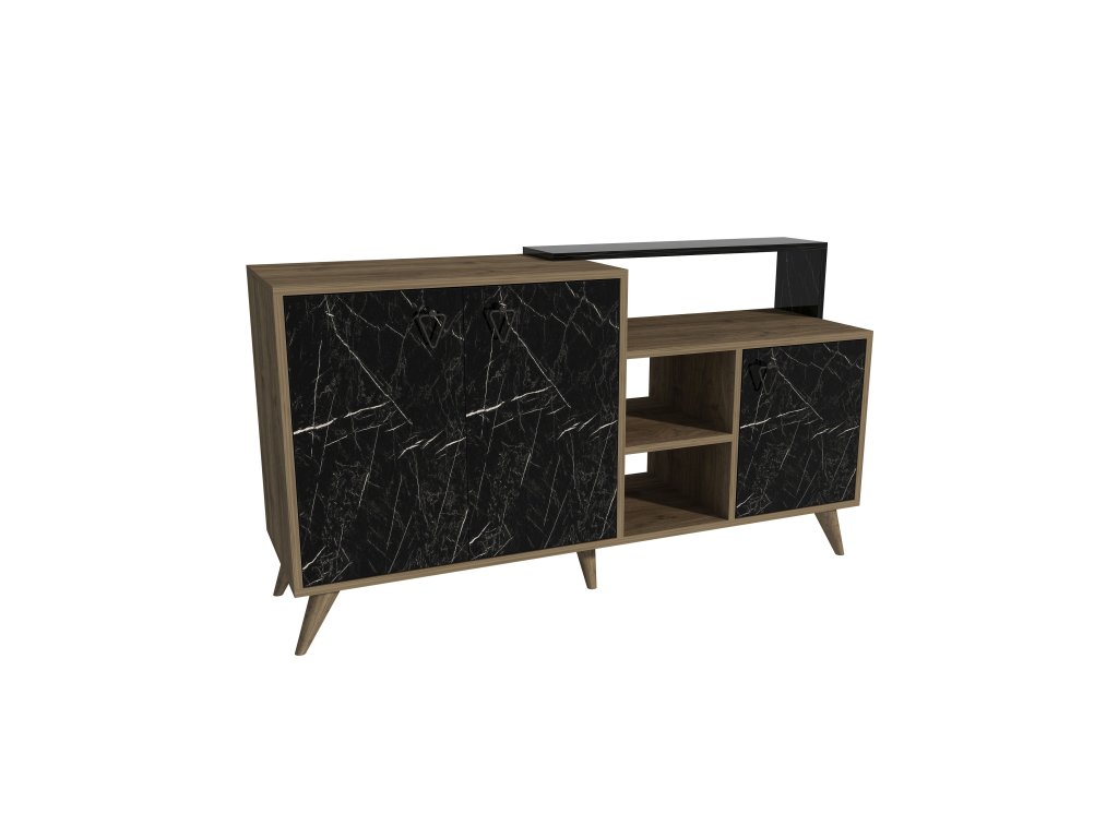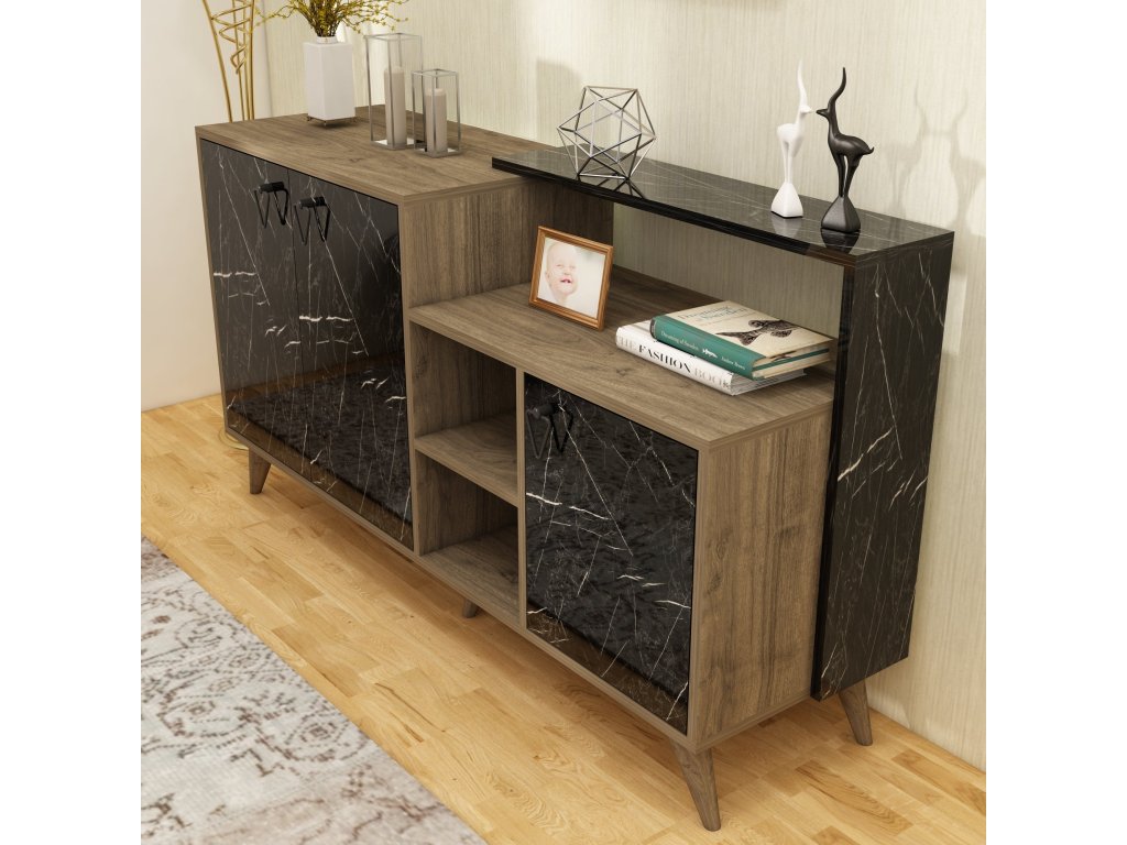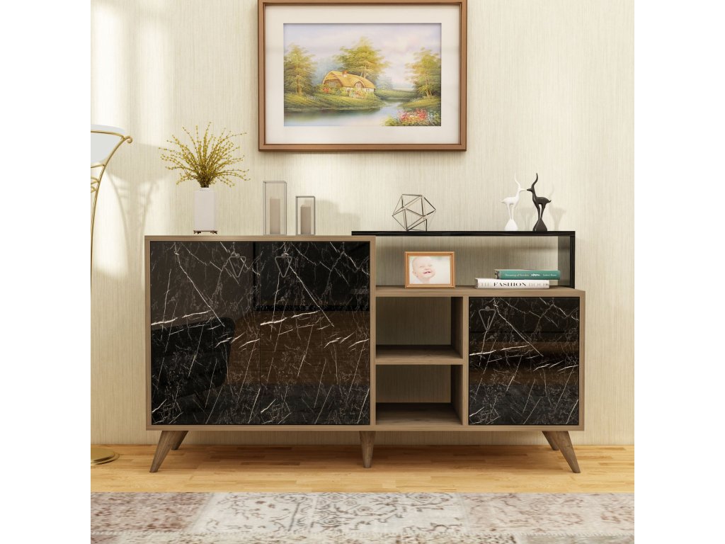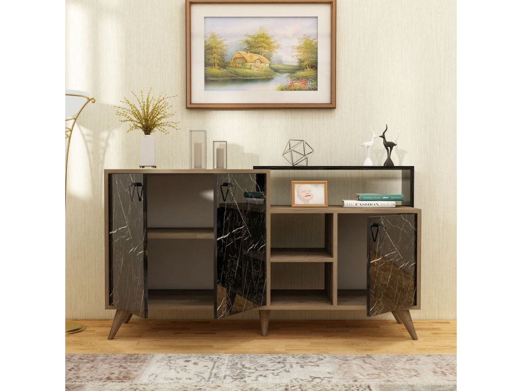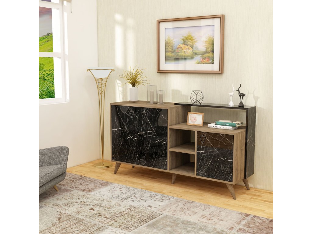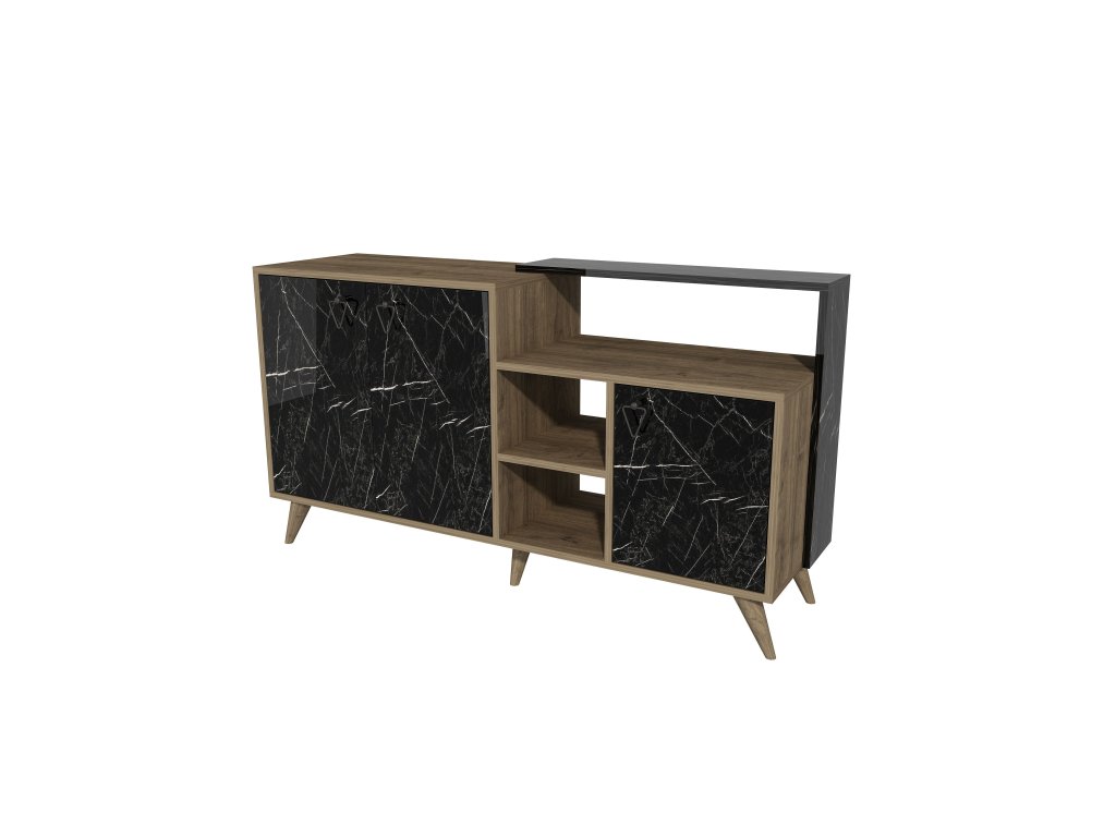 Komoda NEVADA kombinuje moderní design s funkčností, díky čemuž je ideálním řešením pro uspořádání vašeho obývacího pokoje. Nabízí praktické úložné prostory díky třem plným dvířkům a regálku, což zajišťuje dostatek místa pro uspořádání všech vašich věcí. Kvalitní zpracování a estetický vzhled z ní činí stylový doplněk každého interiéru.