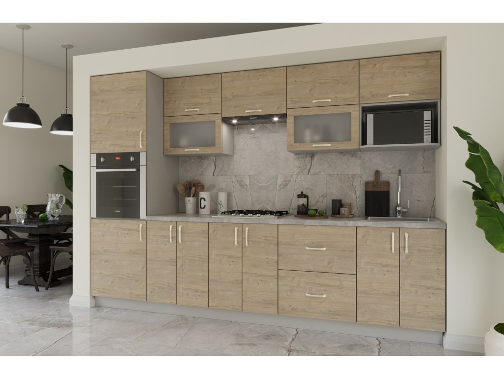 Prostorná kuchyně NOEMI 79 zaujme nejen příjemným barevným provedením přímořský dub, ale také velmi příznivou cenou. Barva korpusu je bílá. Stříbrné kovové úchyty dodávají kuchyni eleganci. Zásuvky mají kvalitní teleskopické výsuvy. Pracovní deska ani sokl nejsou součástí kuchyňské linky.