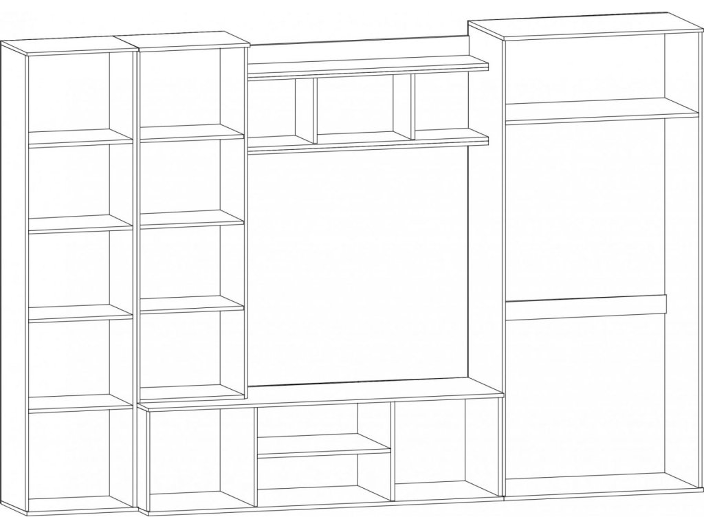 Obývací stěna má ve spodní části stolek pod TV, v horní části je odkládací police. Po obou stranách jsou vysoké skříně s policemi, přičemž jedna z nich disponuje vitrínou.