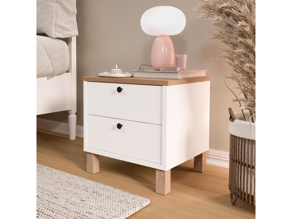 Stolek je vyroben z kvalitního melaminu a VT laminátu, což zajišťuje pevnost, odolnost a snadnou údržbu. Disponuje 2 zásuvkami, které poskytují dostatek prostoru pro odložení knih, doplňků či osobních věcí. Úchytky z matného černého kovu dodávají nábytku moderní kontrastní prvek.