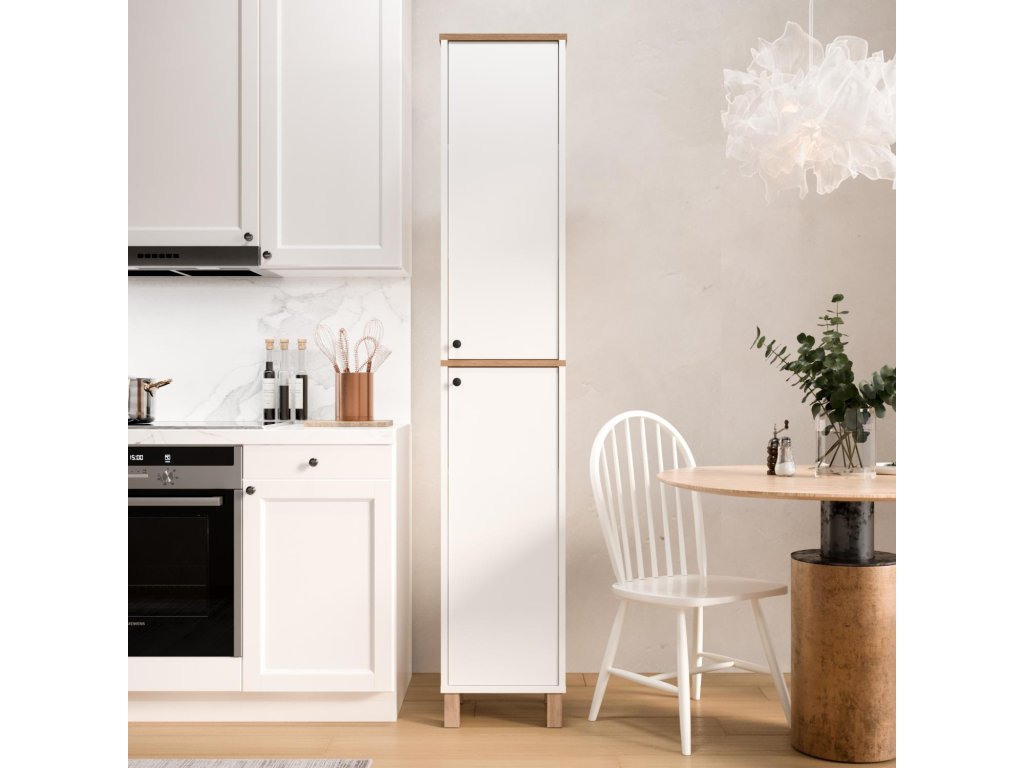 Vyrobena je z kvalitního melaminu a VT laminátu, což zajišťuje pevnost, odolnost a snadnou údržbu i v prostředí se zvýšenou vlhkostí. Vysoké a úzké provedení šetří prostor, přičemž 2 plná dvířka ukrývají praktický úložný prostor. Úchytky z matného černého kovu dodávají nábytku moderní kontrast.
