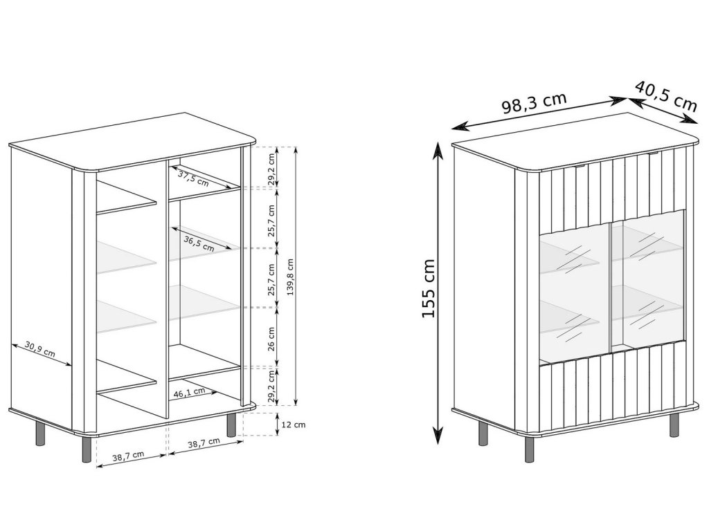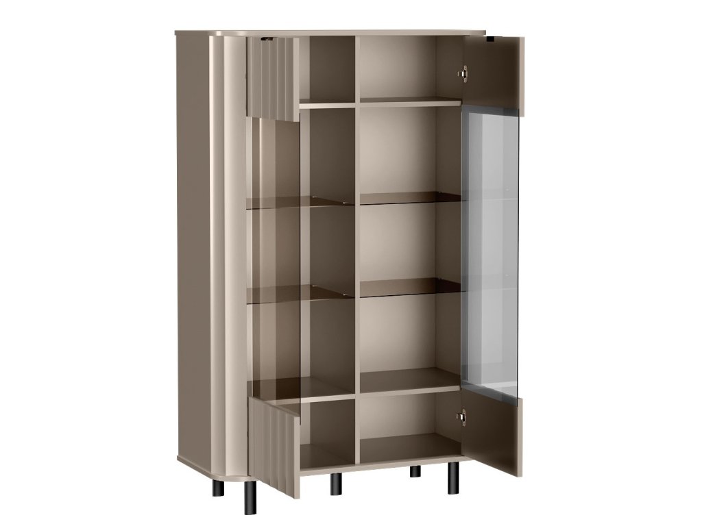 Vitrínu podepírají štíhlé kovové ocelové nožky práškově lakované o výšce 12 cm, které zajišťují nejen stabilitu, ale i lehkost vzhledu a snadnější úklid pod nábytkem. Jsou to kusy nábytku, které se nestylizují násilně, ale spíše podtrhují charakter prostoru.