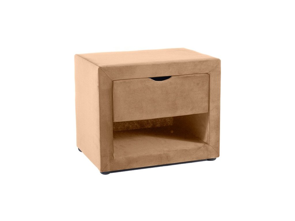 Noční stolek NS-001 patří mezi moderní a elegantní čalouněné stolky. Má 1 zásuvku a jeden otevřený úložný prostor pro odložení časopisů, knih a podobně.