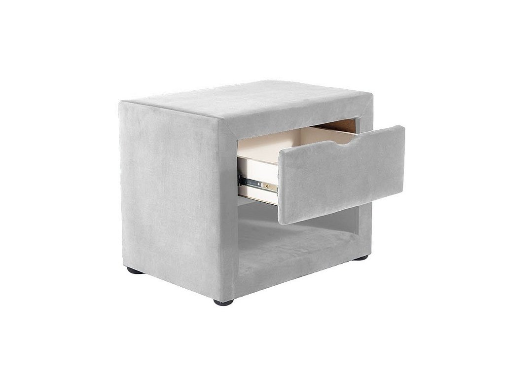 Noční stolek NS-001 patří mezi moderní a elegantní čalouněné stolky. Má 1 zásuvku a jeden otevřený úložný prostor pro odložení časopisů, knih a podobně.