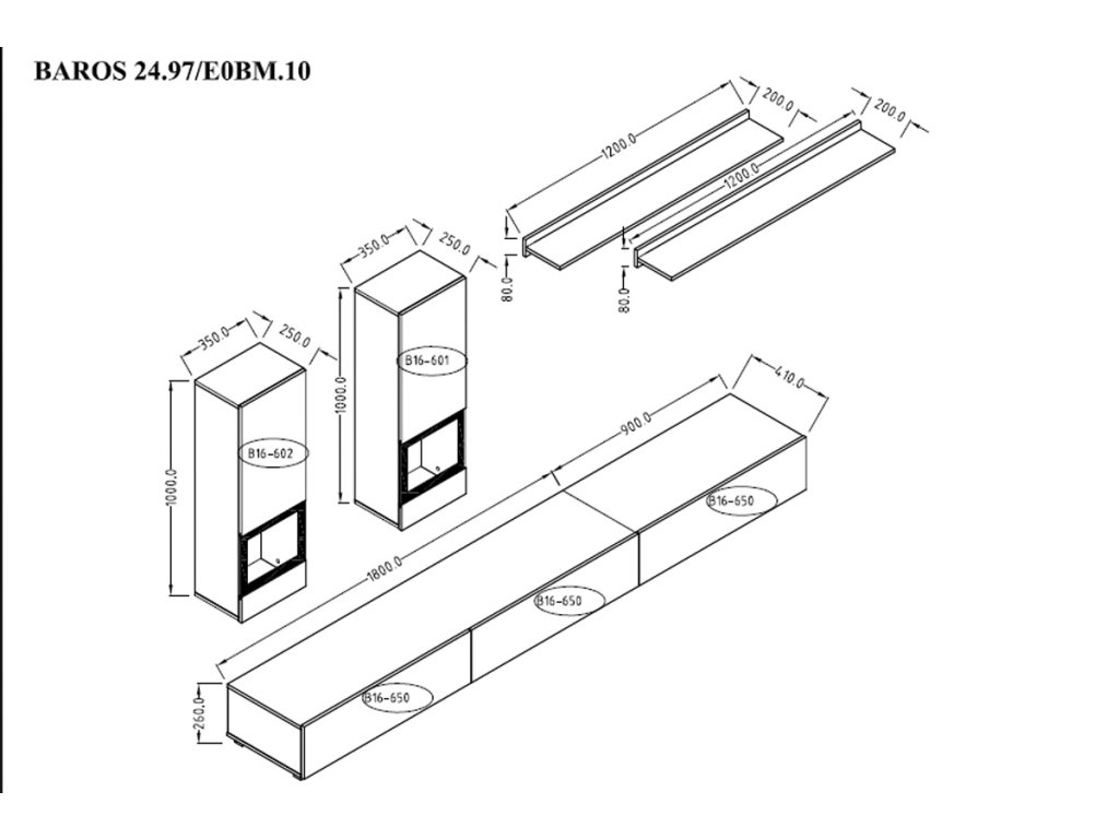 | Sestava obsahuje: | 2 x závěsná skříň 35/100/25, 2 x závěsná police 120/20/8, komoda RTV 180/26/41, komoda RTV 90/26/41 cm. |