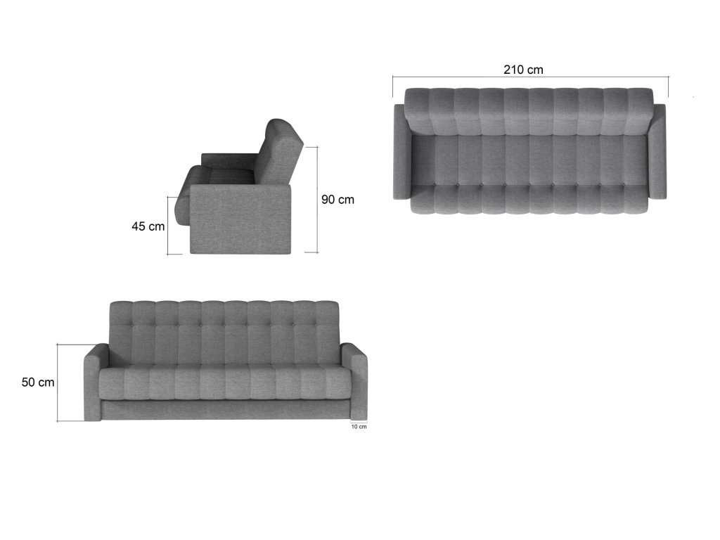 Rozměry (ŠxVxH): 210 x 90 x 85 cm. Výška sedací plochy je 45 cm.