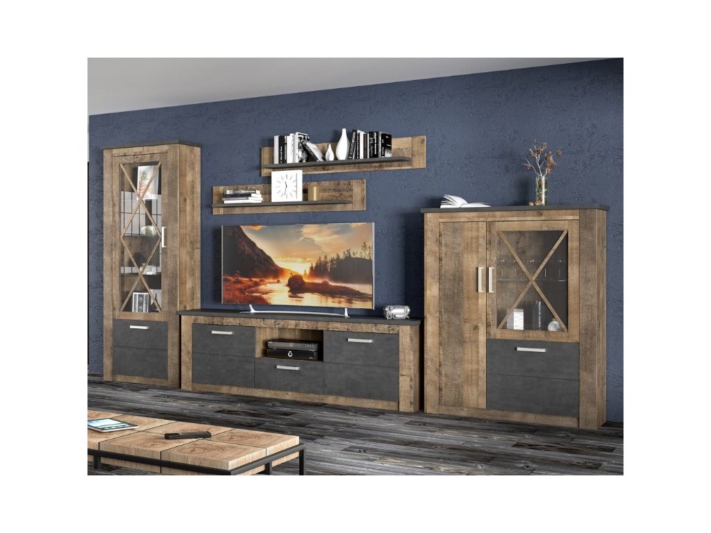 | Sestava obsahuje: | dvoudveřovou komodu s vitrínou (ŠxVxH): 114 x 142 x 38 cm jednodveřovou vitrínu (ŠxVxH): 90 x 205 x 38 cm, 2 x policu (ŠxVxH): 135 x 24 x 20 cm stolík pod TV: (ŠxVxH): 197 x 64 x 42 cm |