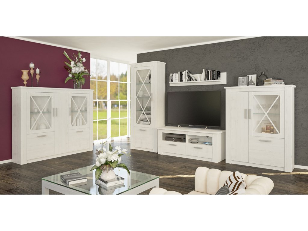 OLEXIE třídveřová komoda s vitrínou, borovice andersen