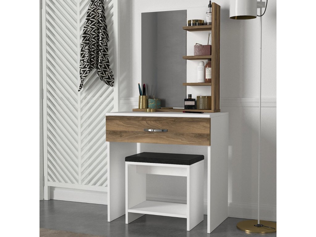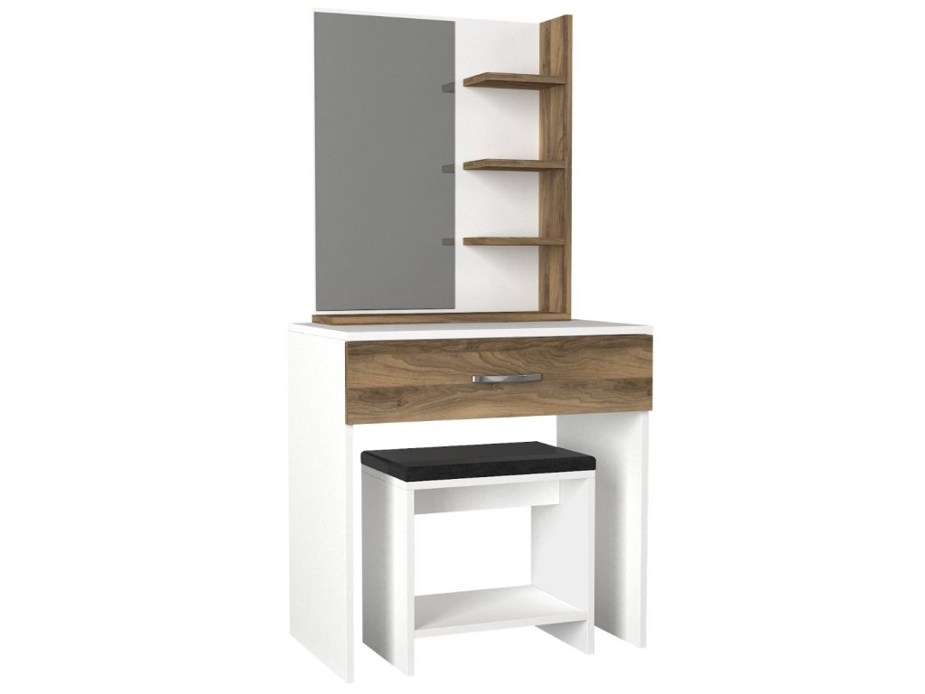 Jednoduchý design toaletního stolku OLIVE nabízí praktický úložný prostor pro vaše kosmetické potřeby v podobě velké zásuvky a otevřených polic vedle zrcadla. Stolek je vyroben z kvalitní LTD desky o tloušťce 18 mm a díky neutrálnímu barevnému provedení jej lze snadno zkombinovat s již zařízeným interiérem v různých stylech.