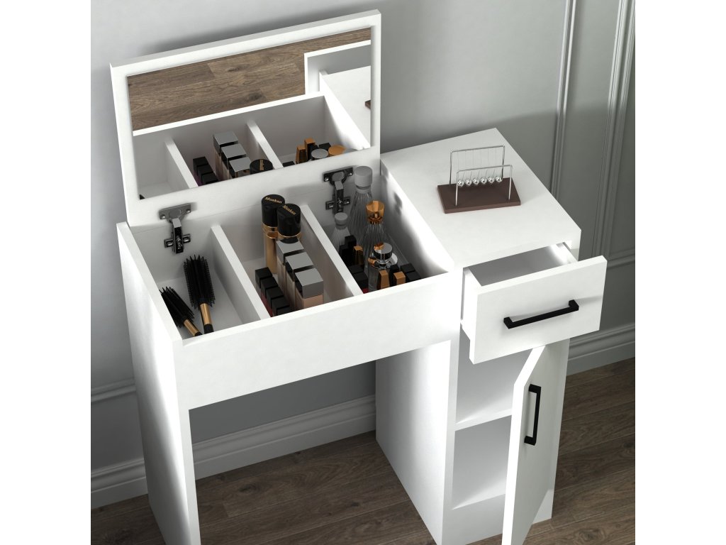 Toaletní stolek OMAHA je ideálním řešením pro každou ložnici, kde je kladen důraz na estetiku a praktičnost. Tento moderní stolek nabízí chytré úložné prostory, včetně zásuvky, plného dvířka a výklopné horní desky se zrcadlem. Díky svému elegantnímu designu a kvalitnímu provedení se snadno stane stylovým doplňkem vašeho interiéru.