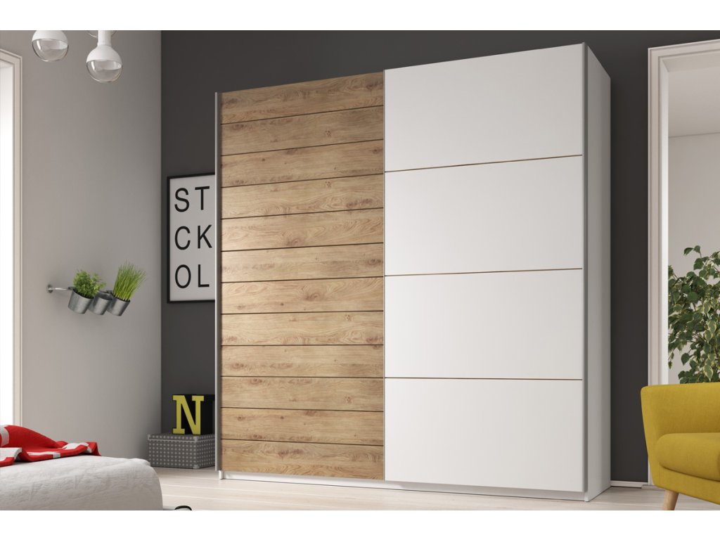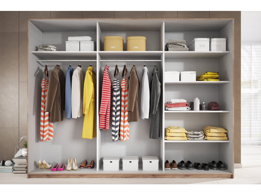 Šatní skříň PALINDA je cenově dostupný a stylový nábytek v aktuálním designovém provedení. Kombinace barev a členění plochy dává nábytku šmrnc a eleganci. Skříň je vhodná jak do ložnice, tak i dětského pokoje či vstupní haly. Nabízí bohatý úložný prostor s praktickým členěním. Je ideální pro lidi, kteří mají rádi eleganci a funkčnost. Skříň je vyrobena z kvalitních LTD desek, které jsou nenáročné na údržbu. Korups nábytku je v bílé barvě, dveře jsou v kombinaci kontrastních barev: bílá/dub beaufort. Skříň je dvoudveřová s posuvným systémem otevírání dveří. Vnitřek skříně je prakticky rozdělen a nabízí 6 polic a 2 šatní tyče na věšení. Rozměry (š,v,h): 270 x 210 x 61 cm. Dodáváme v demontovaném stavu.Doplňkové parametry