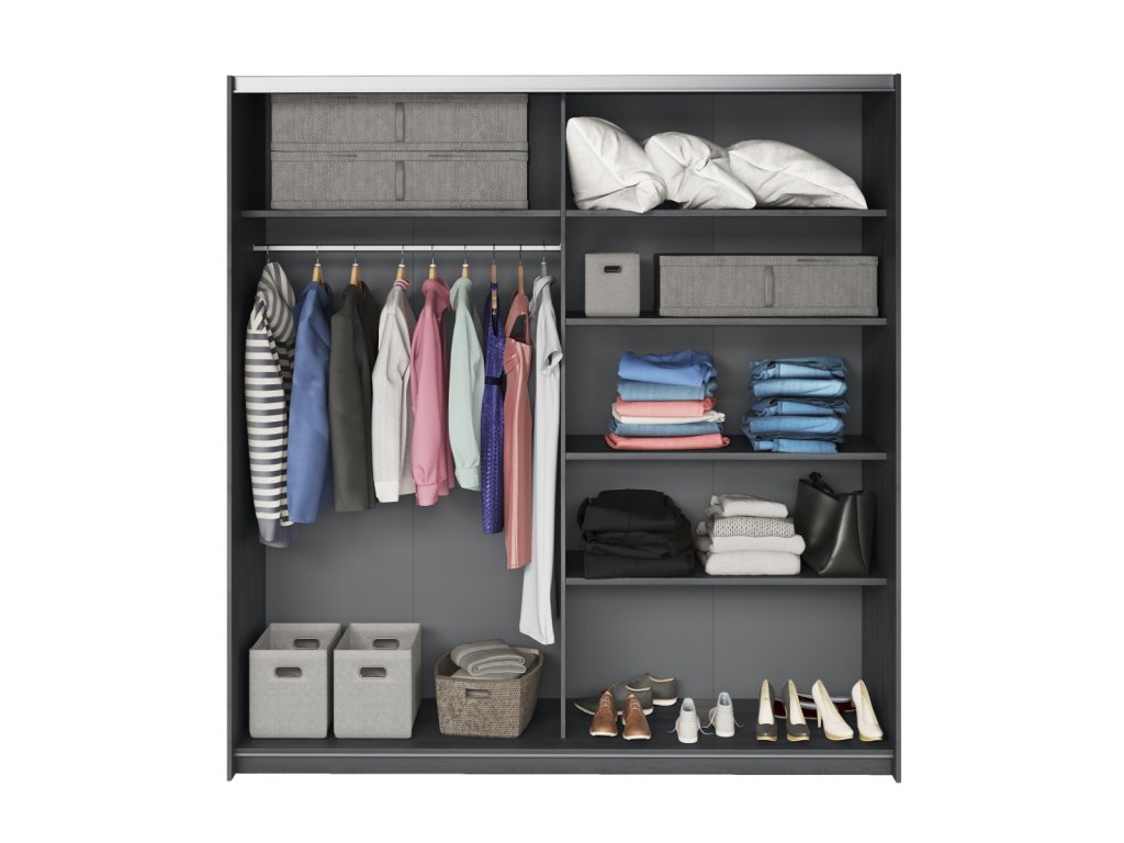 Šatní skříň je dvoudveřová. Dveře jsou posuvné. Uvnitř se nachází 5 polic a jedna šatní tyč.