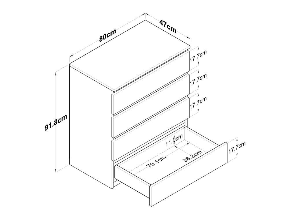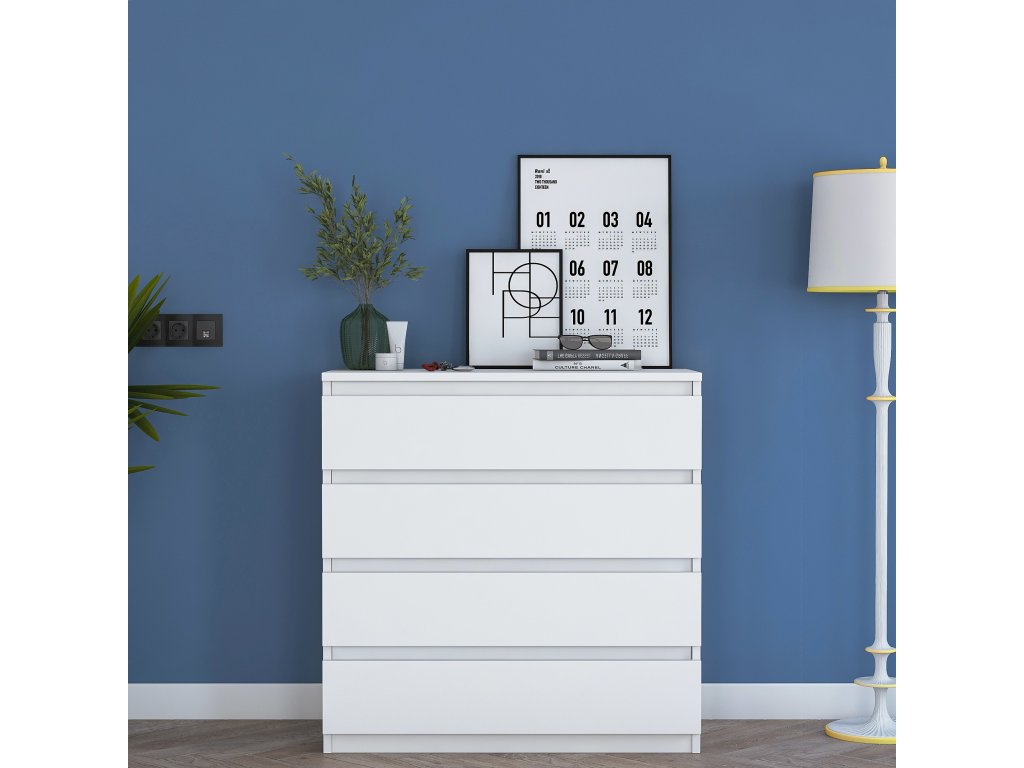 Komoda PARIS nabízí čtyři prostorné zásuvky, které poskytují dostatek místa pro uložení všech potřebných věcí, ať už jde o dokumenty, knihy nebo jiné drobnosti. Kvalitní materiály, jako melamin a VT laminát, zajišťují vysokou odolnost a snadnou údržbu.