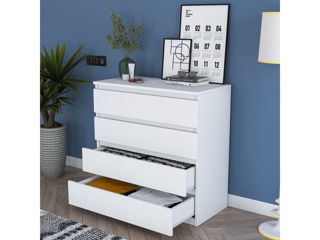 Díky svému kompaktnímu designu a univerzálnímu stylu se komoda hodí do různých typů interiérů – od moderních po klasické. Je dodávána v demontovaném stavu s jednoduchým návodem na sestavení.