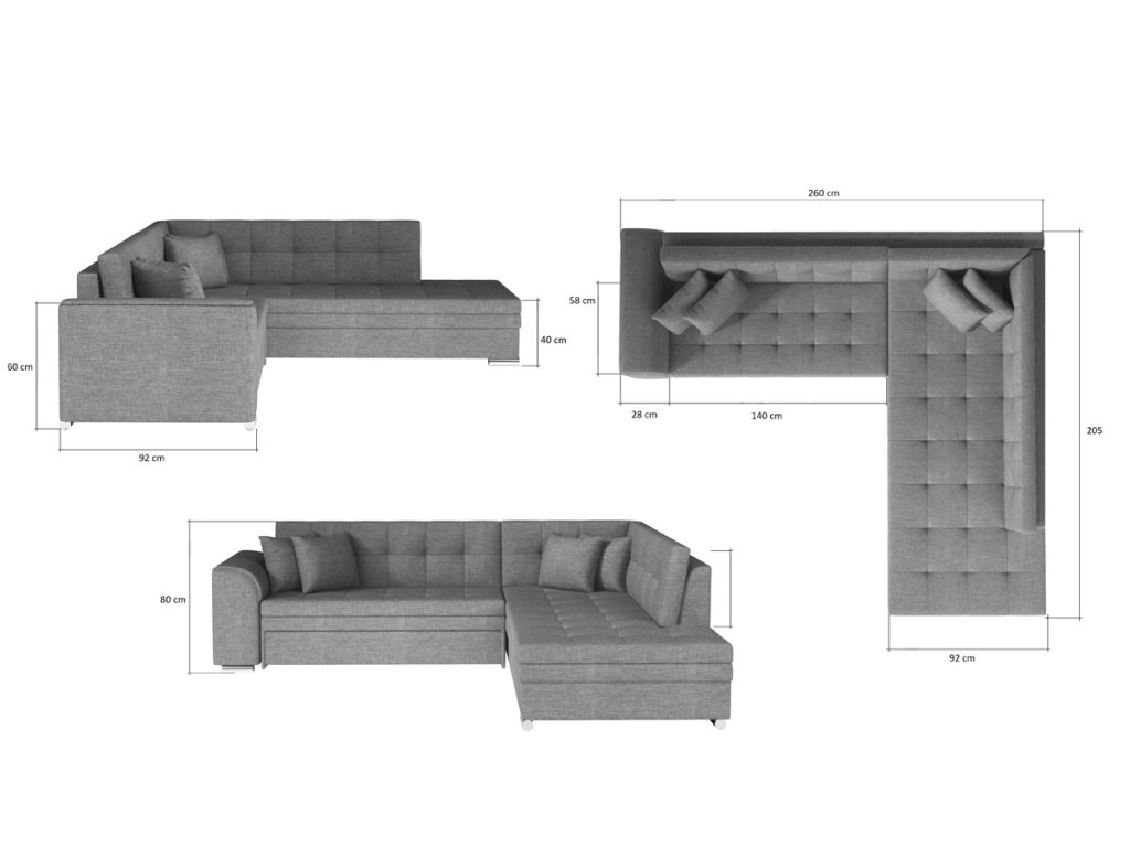 Sedačka je vyrobena v levém provedení rohu. Je celočalouněná, vhodná i pro umístění v prostoru. Na čalounění je použita kvalitní látka Kronos 09. Celkové rozměry (š/v/h): 260 x 80 x 205cm. Hloubka sezení 58 cm, výška sezení 40 cm.