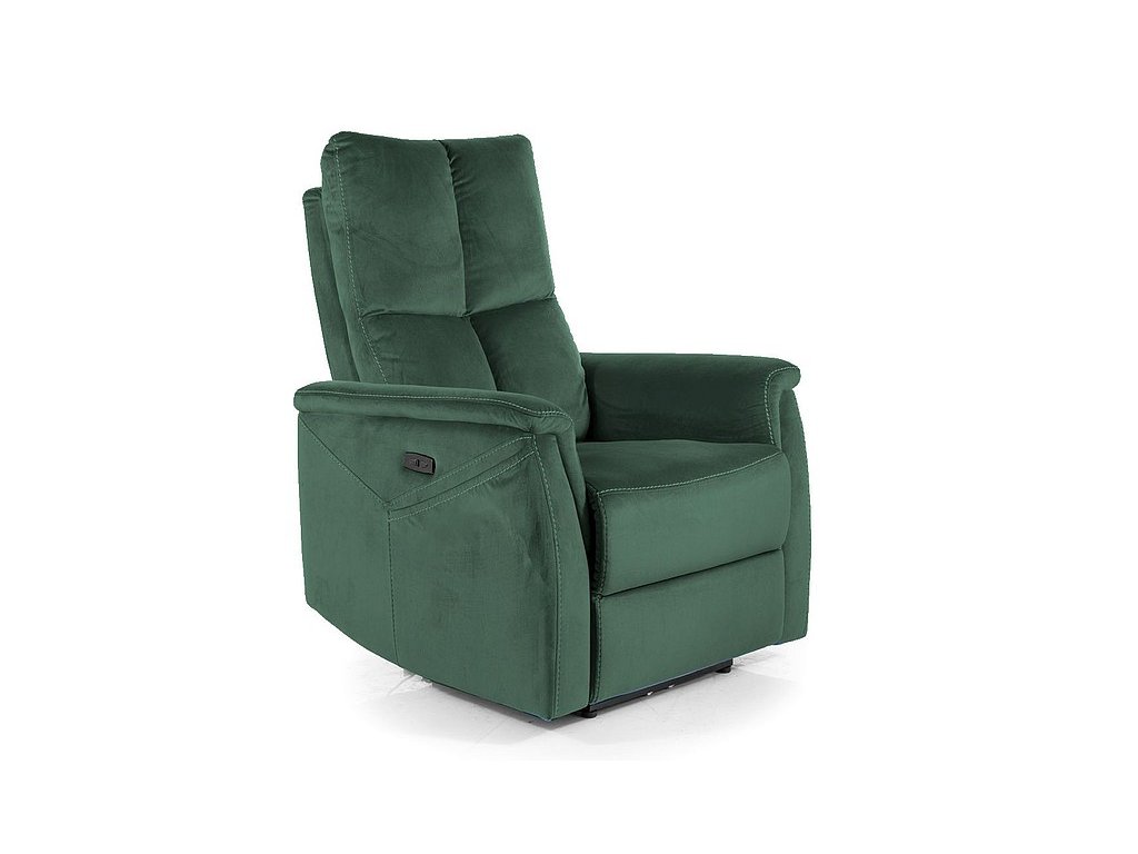 Je čalouněno kvalitní sametovou látkou Bluvel 78 v zelené barvě. Na opěrkách je umístěn úchyt pro manipulaci s křeslem. Disponuje masážní funkcí, což jistě oceníte po namáhavém dni, či jen tak při dívání televize, čtení knížky a podobně. Na boční straně křesla je praktická kapsa, kam si můžete odložit ovladač pro masáž.