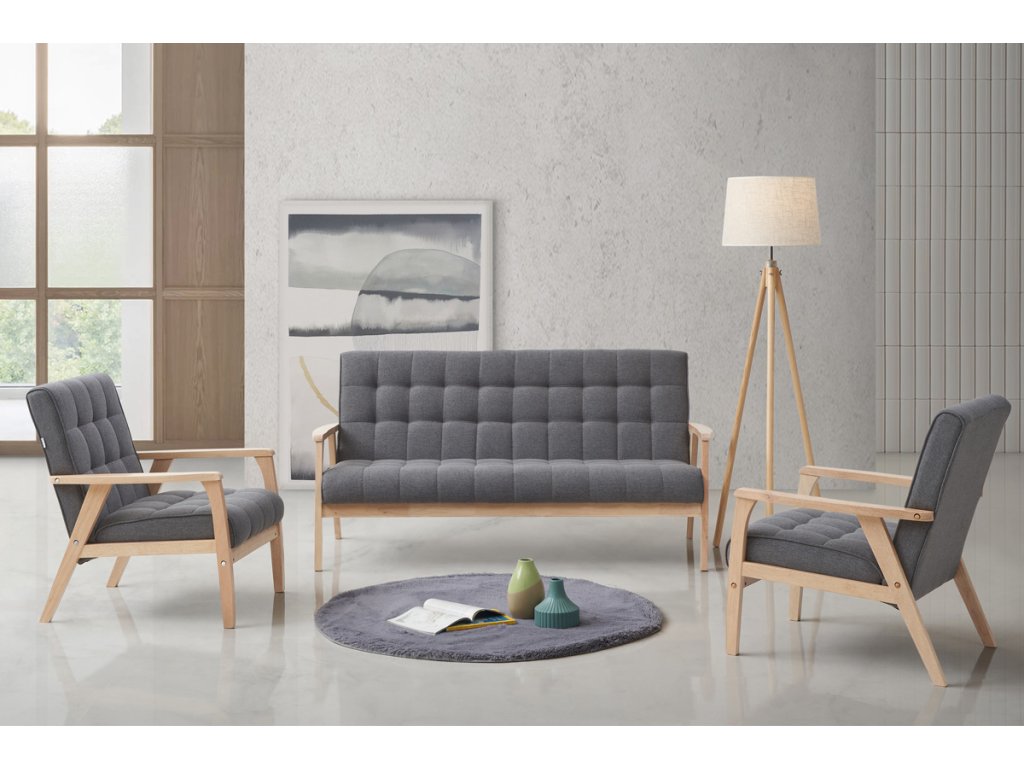 Sedací souprava PETRONELA v žádaném retro stylu osloví svým jednoduchým provedením. Konstrukce sedací soupravy je vyrobena z masivu v barveném odstínu dřeva - bílá lazura. Čalouněné části jsou v látce v barevném provedení tmavě šedá. Výrazné prošívání sedáku a opěrkové části dodává nábytku atraktivní vzhled. Kombinace látky s masivem zvýrazňuje celkové provedení tohoto nábytku. Pohodlné sezení zaručuje PUR pěna s pružnými čalounickými pásy. Výška sedu je 40 cm a hloubka sedu je 52 cm. Výška područek je ve vyšším bodě 53 cm a v nižším bodě 51 cm. Součástí sestavy je 1 trojsedák a 2 křesla. Rozměry trojsedáku: š/h/ve 162 x 75 x 81 cm. Rozměry křesla (š/h/v): 65 x 75 x 81 cm. Třísedák i křeslo lze doobjednat i samostatně. Dodáváme v demontovaném stavu.Doplňkové parametry