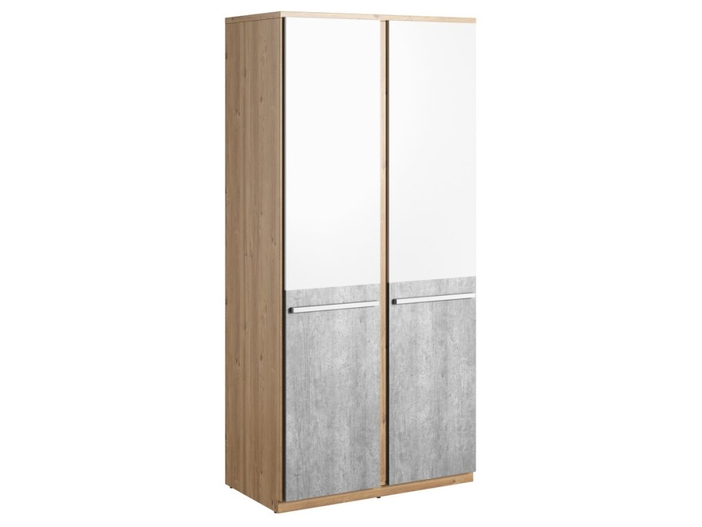 Šatní skříň dvoudveřová v moderním stylu. Korpus je vyroben z desky LTD v barvě dub nash, dvířka jsou vyrobeny z desky LTD v kombinaci barev šedá/bílá. Uvnitř skříně je šatní tyč a police. Dodáváme v demontovaném stavu.Doplňkové parametry