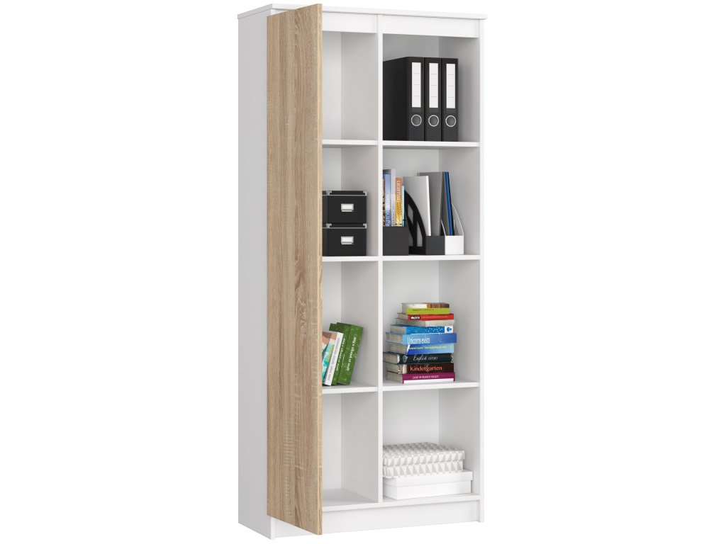 - Vybavení: Skříňka s plnými dvířky pro skryté uložení a celkem 8 polic nabízí dostatek místa pro knihy, dekorace a další potřeby.