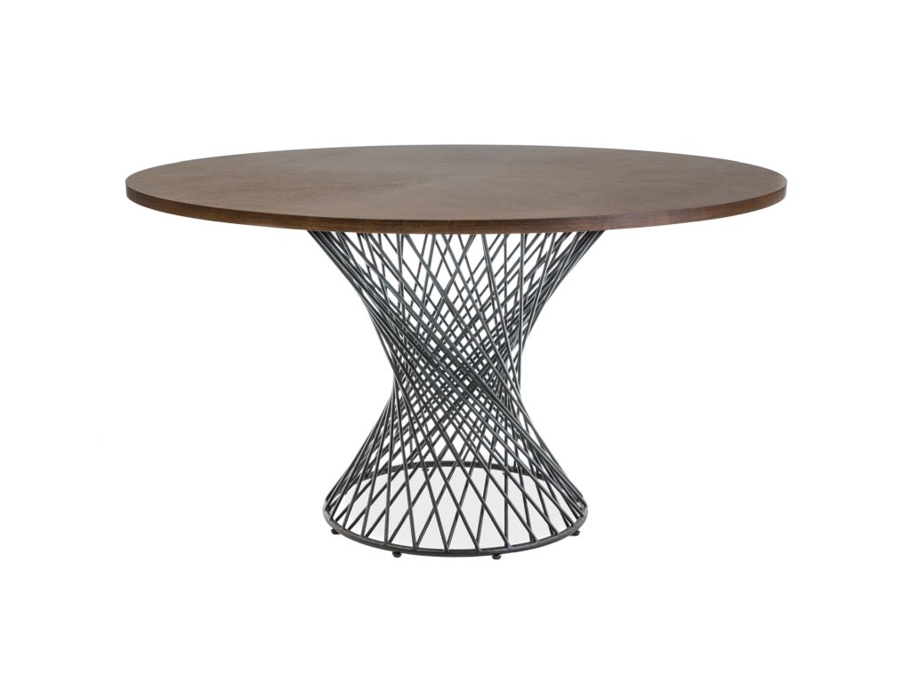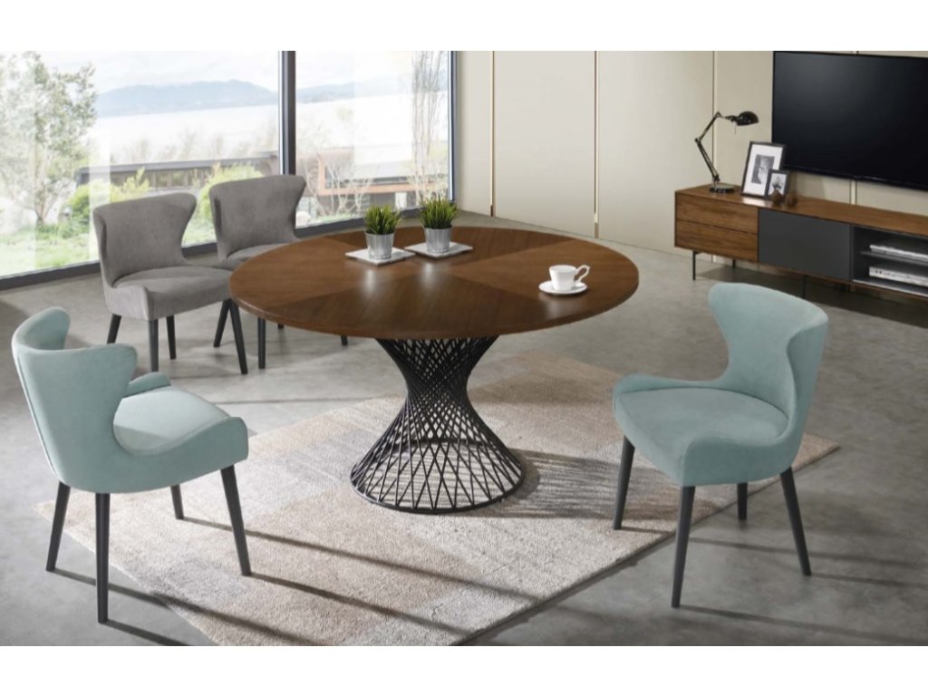 Designový kulatý stůl vhodný do moderních interiérů a interiérů ve stylu loft. Konstrukce stolu je kovová v černé barvě, vrchní deska je vyrobena z MDF v kombinaci s přírodní dýhou v provedení ořech. Rozměry stolu (výška/průměr v cm): 75/137 Dodáváno v demontu. Na vzorovém obrázku je stůl zobrazen se židlemi TASSO.Doplňkové parametry