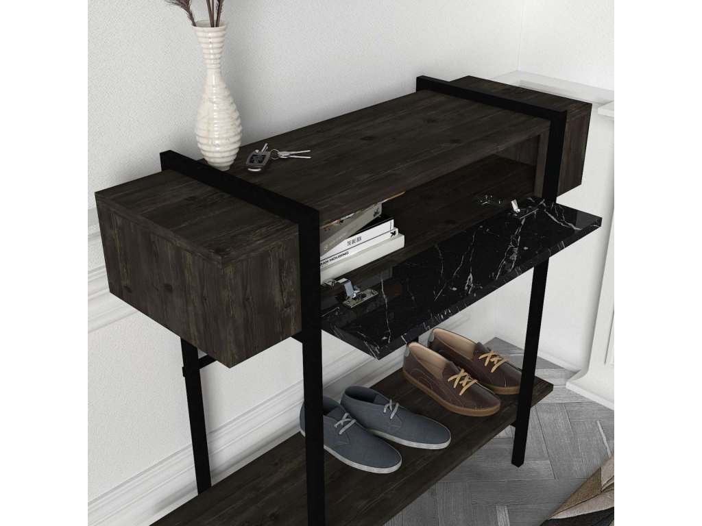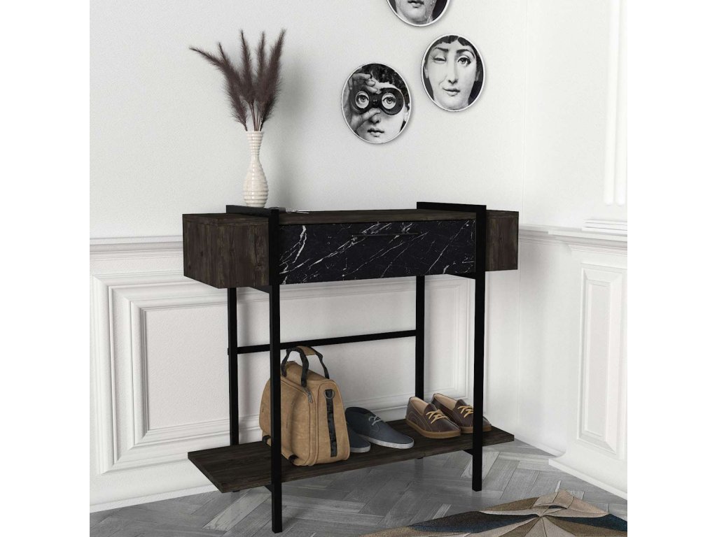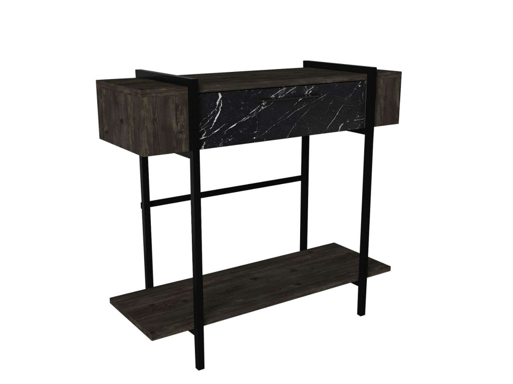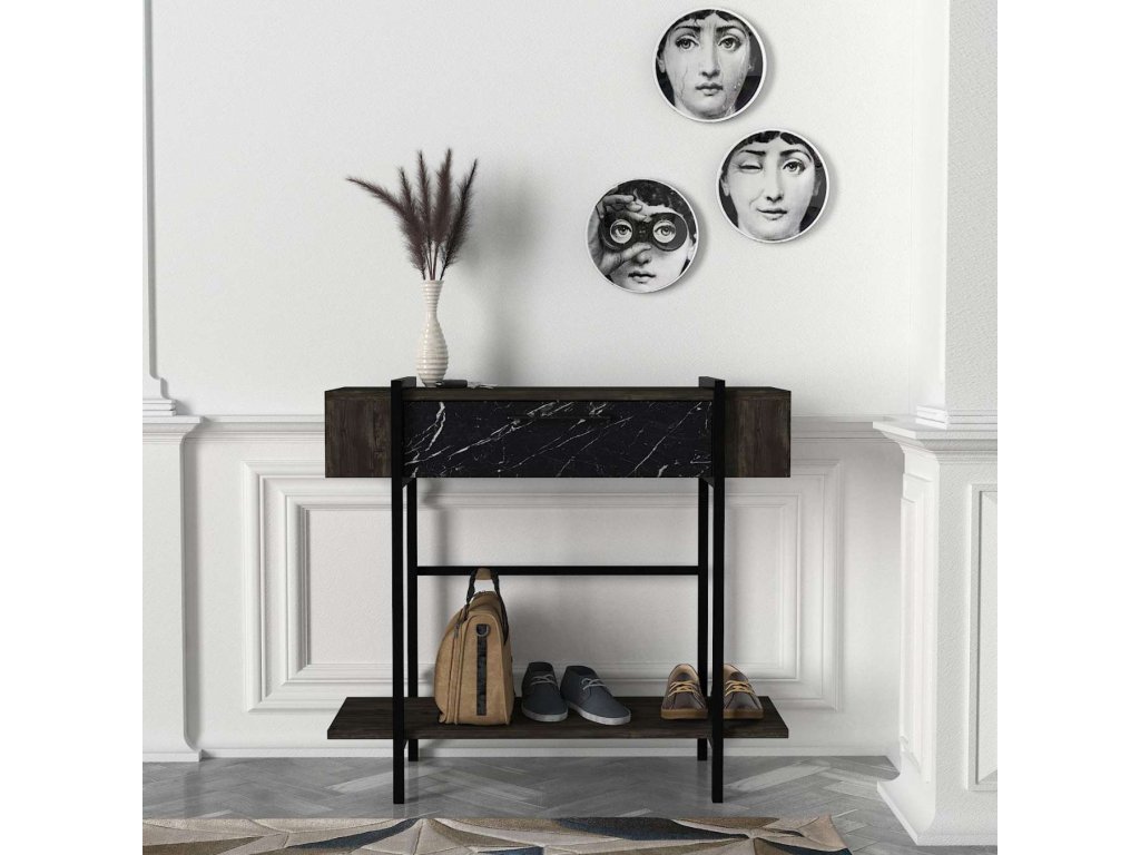 Konzolový stolek PORTUGAL se svým tmavě hnědým dekorem a mramorovým vzorem přidává každému interiéru sofistikovaný vzhled. Praktická dvířka poskytují dostatek úložného prostoru pro vaše osobní věci, čímž zajišťují, že váš prostor zůstane vždy uklizený a organizovaný.