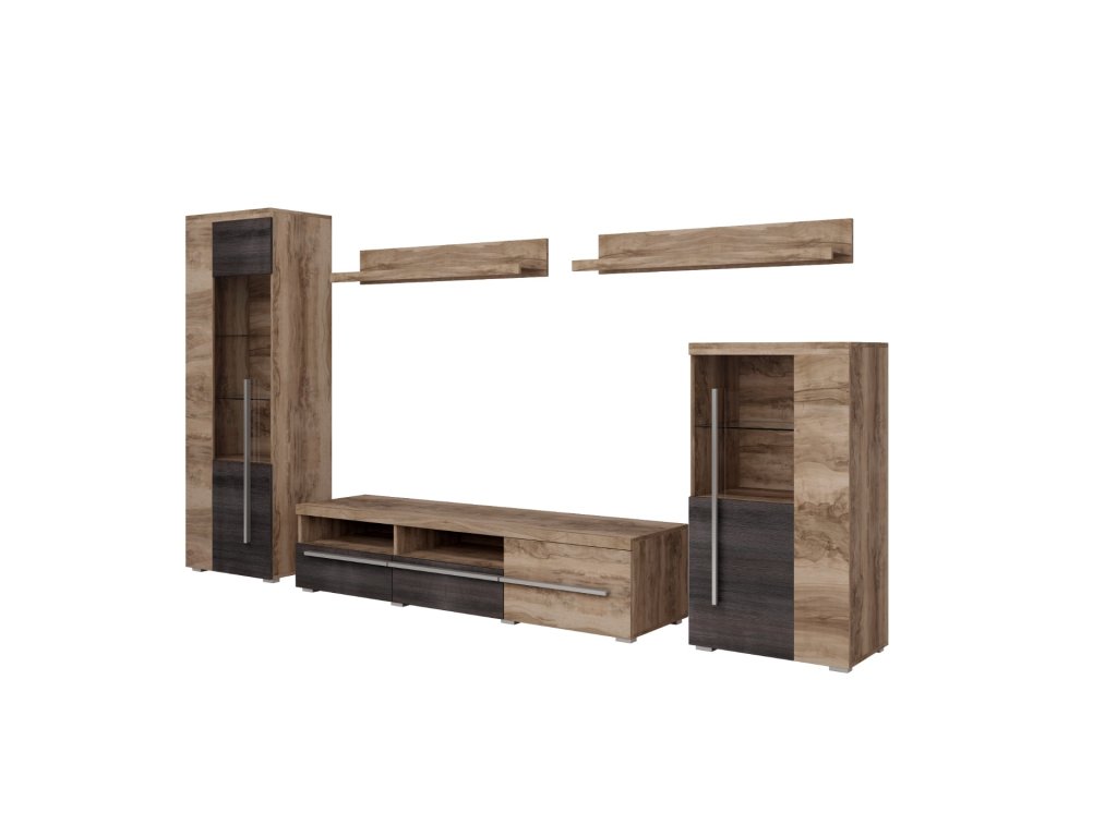 | Sestava obsahuje: | vysoká vitrína 160x35x55cm, TV stolek 200x40x35cm, závěsná police 120x20x15cm, závěsná vitrína 55x35x100cm |