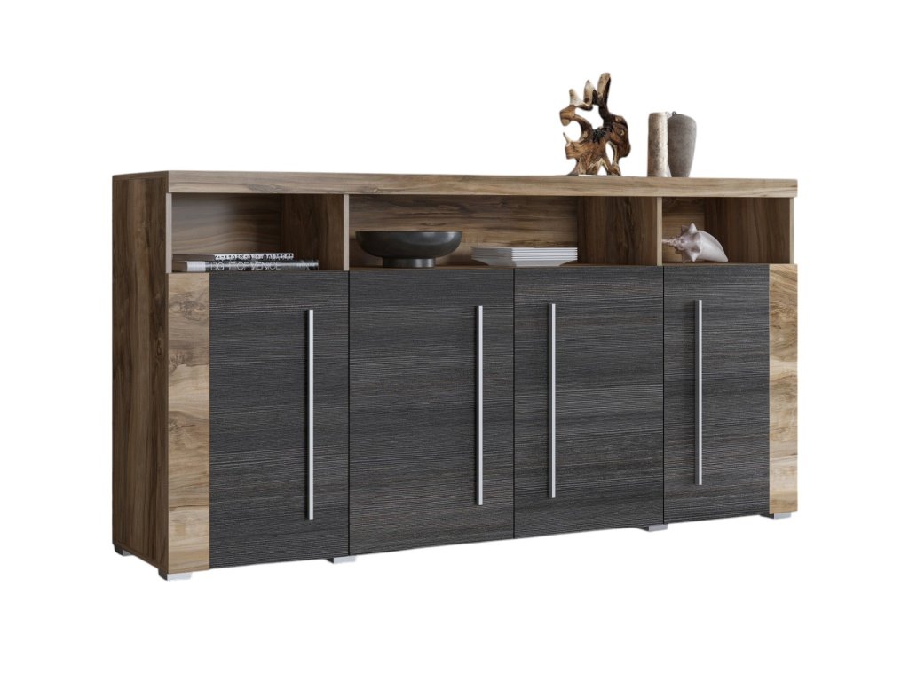 Komoda POUND je ideálním doplňkem do vašeho obývacího pokoje, který spojuje moderní design s praktickým úložným prostorem. Díky povrchové úpravě v dekoru ořech Satin + touchwood vytváří hřejivou a příjemnou atmosféru v interiéru. Nabízí 4 plná dvířka a regálek, což poskytuje dostatek místa pro uspořádání všech potřebných věcí.