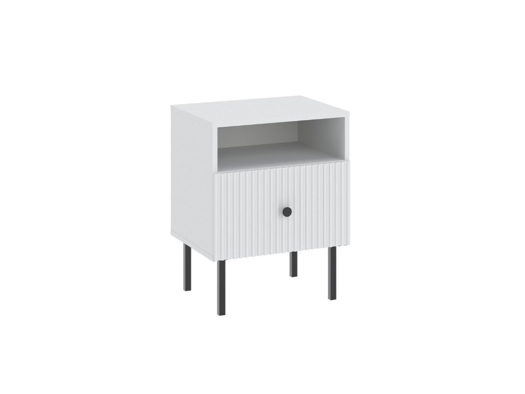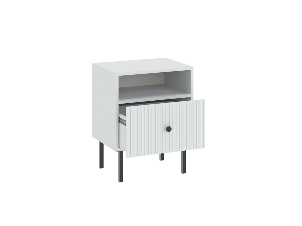 Noční stolek je vyroben z kvalitních LTD desek, které jsou nenáročné na údržbu. Nožičky jsou kovové. Stolek disponuje jednou zásuvkou a otevřenou policí.