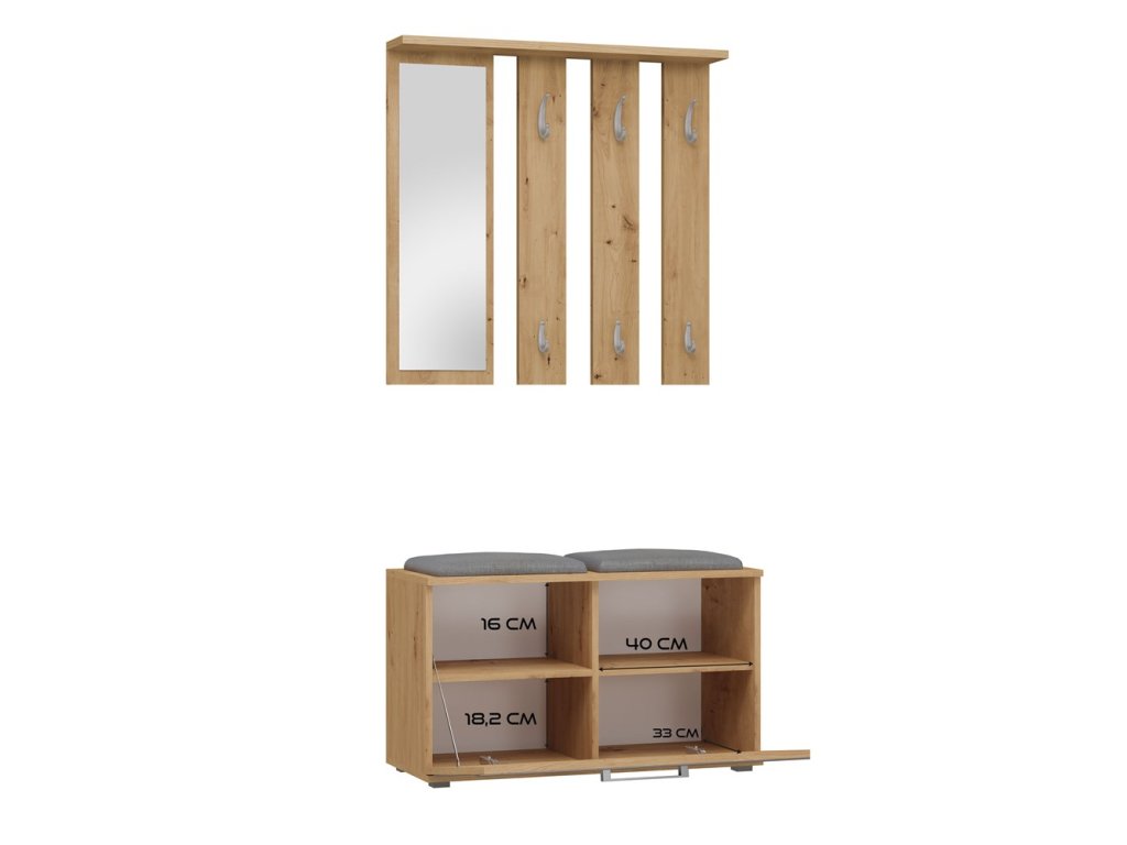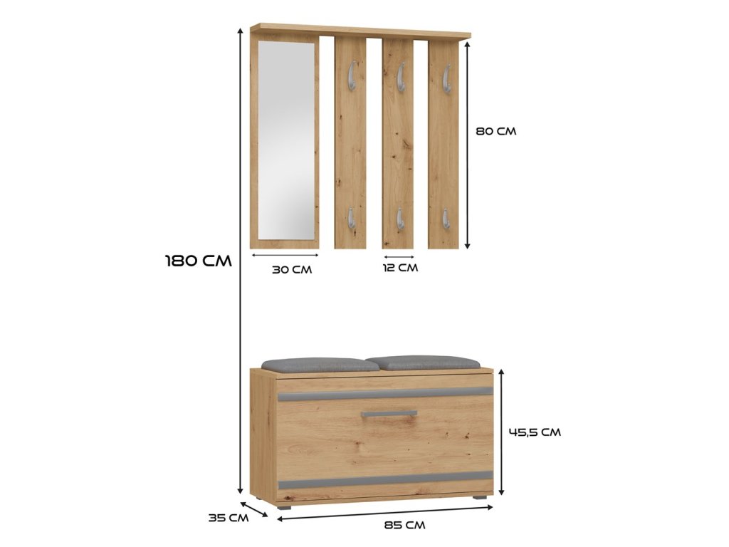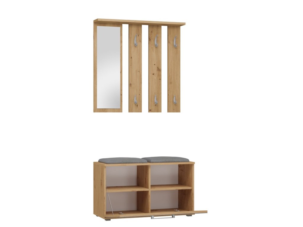 Předsíňová sestava KENT v barvě Dub Artisan je nejen esteticky působivá, ale také plně funkční. Výklopné přihrádky a věšáky vám umožní udržet pořádek ve vaší předsíni, zrcadlo je praktickým prvkem pro rychlou kontrolu vašeho vzhledu před odchodem z domova a botník se sezením vám poskytne komfortní místo k obouvání či svlékání obuvi.