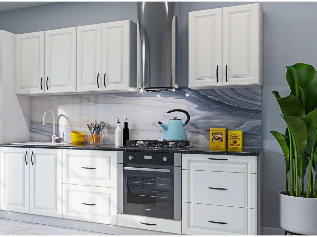 | Sestava obsahuje: | dolní dřezová skříňka 80/82 cm, zásuvková skříňka 60/82 cm, skříňka na vestavnou troubu 60/82 cm, zásuvková skříňka 60/82 cm, horní skříňka 80/72 cm, 2 x horní skříňka 60/72 cm |