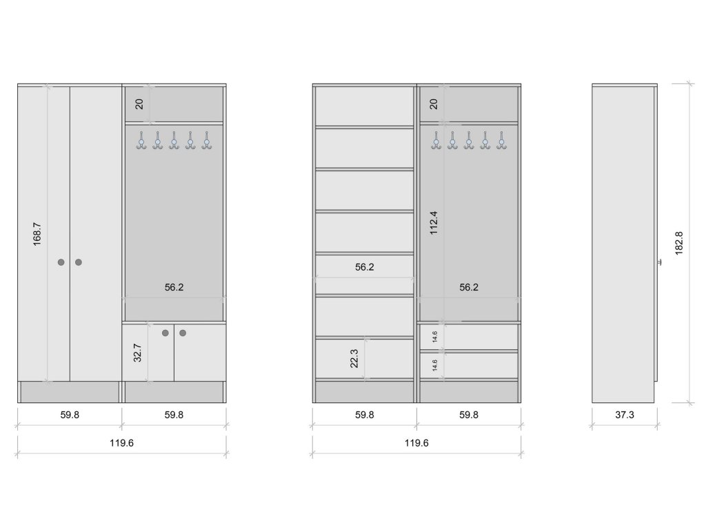 | Sestava obsahuje: | šatní skříň, skříň na boty, věšák |