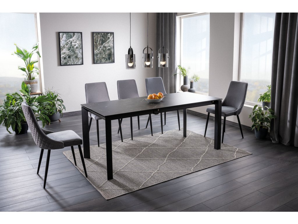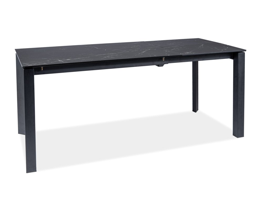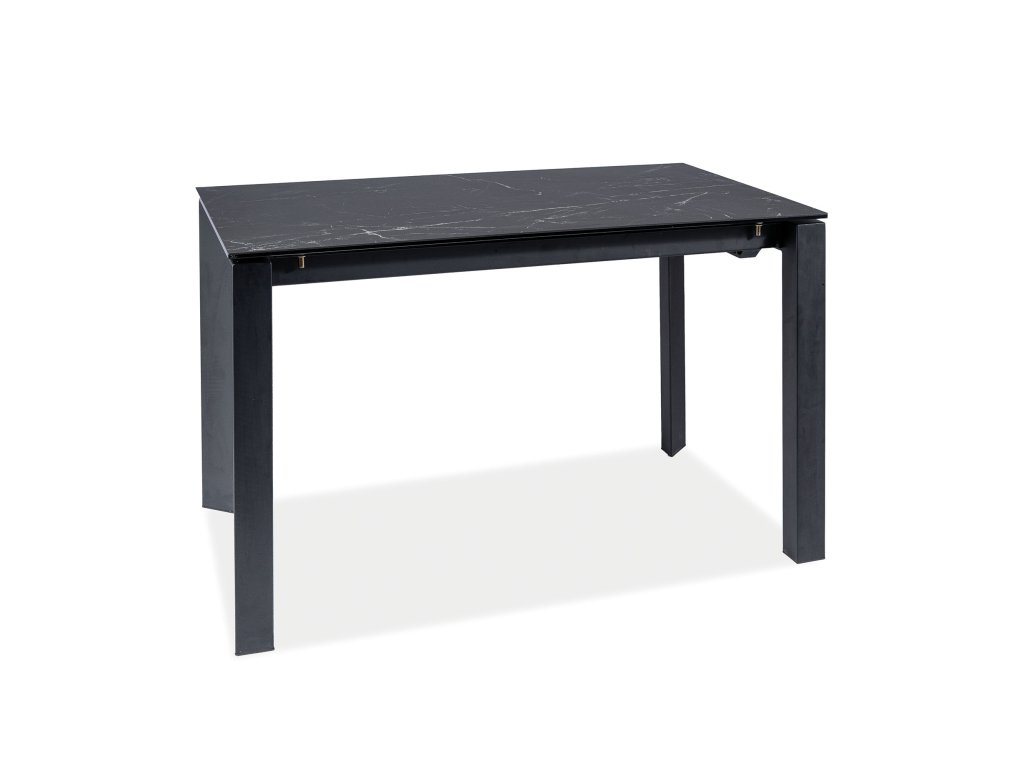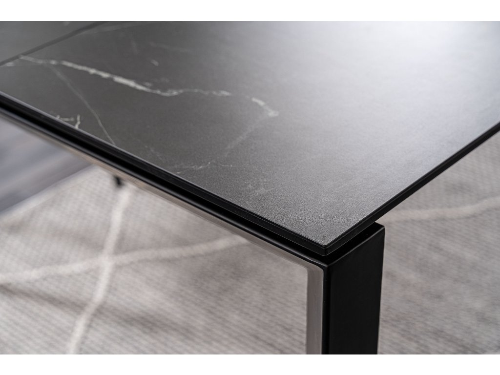 Konstrukce stolu je kovová. Vrchní deska je vyrobena v kombinaci sklo+keramika. Stůl je rozkládací. Barevné provedení: černá s efektem mramoru, nohy v černé barvě.