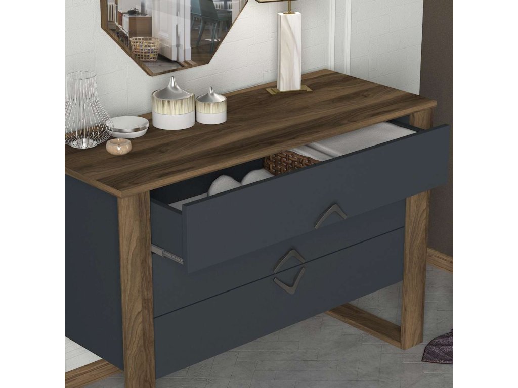Komoda RANG M kombinuje moderní design s praktickými prvky. Elegantní kombinace ořechové barvy a antracitových detailů dodává nábytku sofistikovaný vzhled. Tři prostorné zásuvky poskytují dostatek úložného prostoru pro vaše potřeby. Skleněné detaily dodávají komodě na lehkosti a modernosti. Součástí sestavy je také nástěnné zrcadlo, které skvěle doplní celkový vzhled vašeho interiéru.