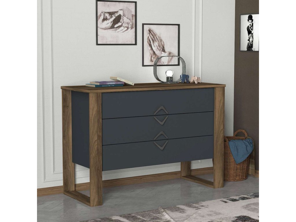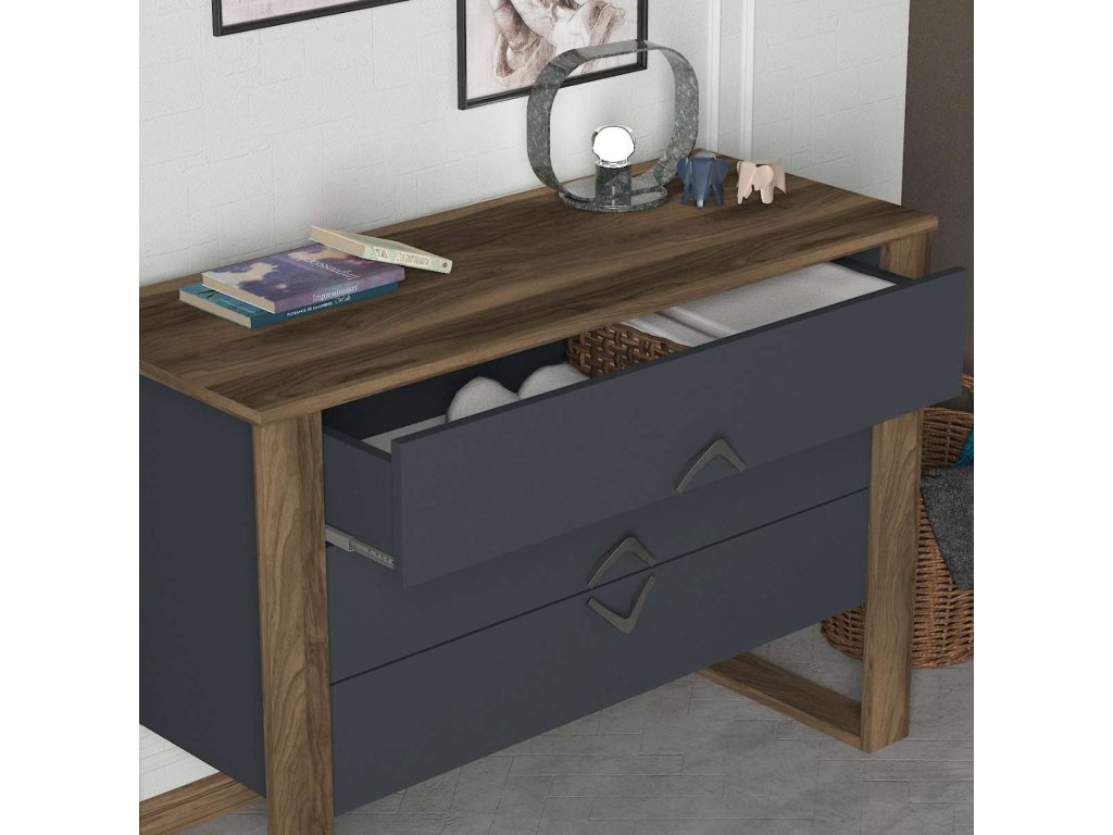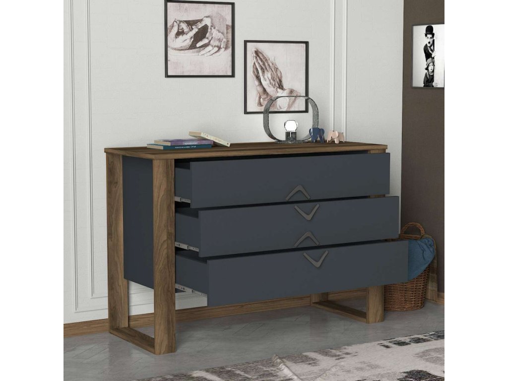 Komoda RANG se vyznačuje moderním designem, který kombinuje elegantní ořechovou barvu s antracitovými detaily. S třemi prostornými zásuvkami nabízí dostatek úložného prostoru pro vaše věci. Materiál LTD o tloušťce 18 mm zajišťuje pevnost a dlouhou životnost nábytku.