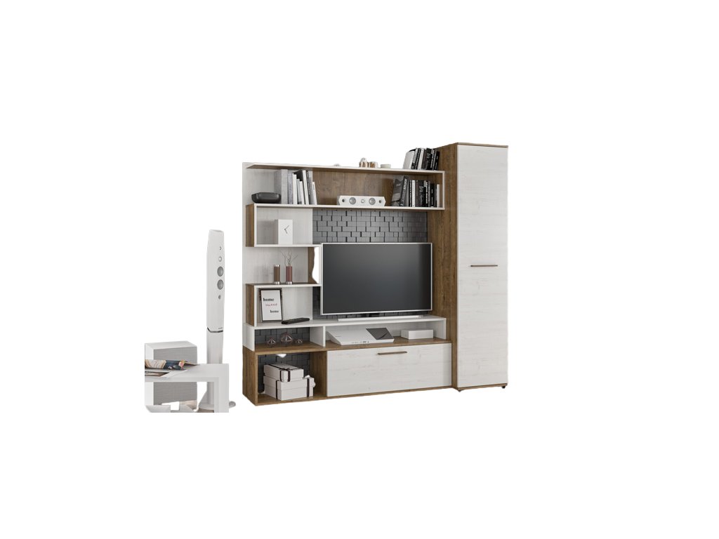 Díky zajímavým designovým prvkům a kontrastnímu dvoubarevnému provedení je ideální do každého moderního interiéru. Sestava nabízí několik poliček pro umístění dekorace či knih. Středový prostor je vyhrazen pro TV (Rozměr (š/v): 100,3 x 82,4 cm).