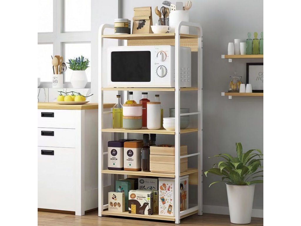 Funkční a zároveň stylový regál vyniká úložným prostorem v podobě otevřených polic. Regál využijete k odložení třeba mikrovlné trouby, suchých potravin, dekorací, rostlin nebo jako malou knihovnu.