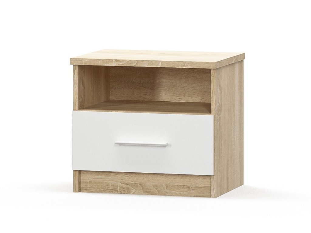 Do Vaší ložnice přicházíme s nabídkou moderního ložnicového nábytku REBEKA, který zahrnuje praktický nábytek s jemnými liniemi. Kombinace barev dub sonoma a bílá vám vytvoří klidnou atmosféru pro spokojený odpočinek a relaxaci. Součástí ložnicového sektoru je noční stolek REBEKA. Je vyroben z vysoce kvalitního LTD materiálu. Doplněno o ABS hrany. Stolek má jeden odkládací šuplík a jednu úložnou polici. Eleganci mu dodává úchytka stříbrné barvy. Dodáváme vždy 2 noční stolky. Barevné provedení dub sonoma a bílá matná. Rozměry: - výška: 45,5 cm, - šířka: 51 cm, - hloubka: 37 cm. Dodáváme v demontu, přičemž montáž je velmi jednoduchá.Doplňkové parametry