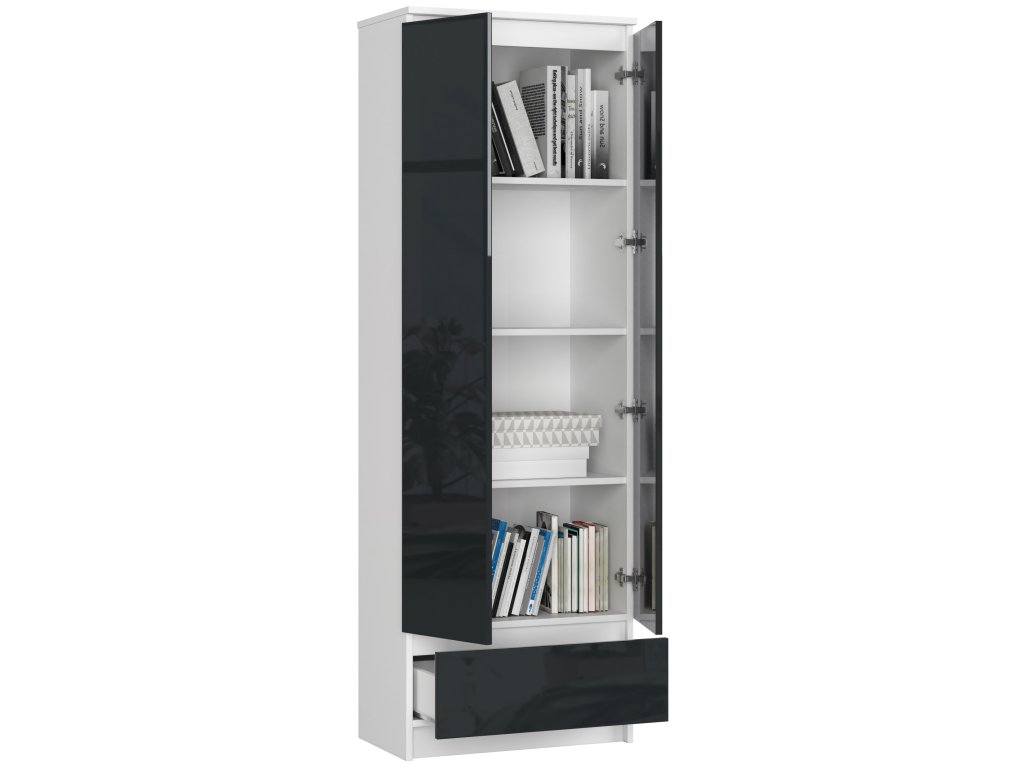 BEBE60 kombinuje čistotu bílé s hlubokým a lesklým grafitovým dekorem. Tato policová skříň představuje elegantní a funkční kousek nábytku, který se dokonale hodí jak do obývacího pokoje, tak do kanceláře či pracovny.