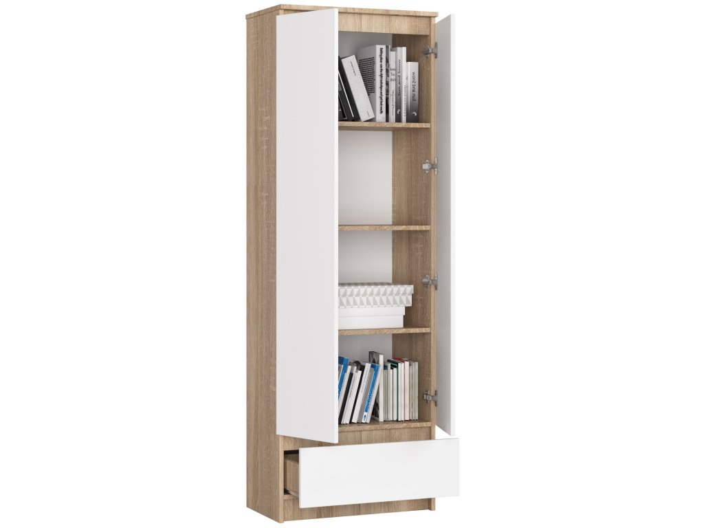 BEBE60 je reprezentantem moderního nábytkového designu. Tato policová skříň skvěle kombinuje teplý odstín dubu Sonoma s čistou bílou, což vytváří skvostný kousek vhodný do každého obývacího pokoje, kanceláře nebo pracovny.