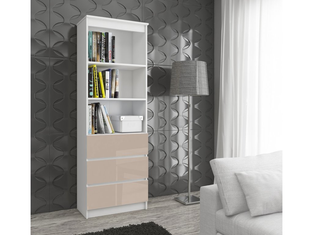 Dejte svému interiéru moderní vzhled s regálem CLAUDY60. Elegantní kombinace bílé a capuccino lesku dodá vašemu obývacímu pokoji, kanceláři nebo pracovně luxusní nádech.