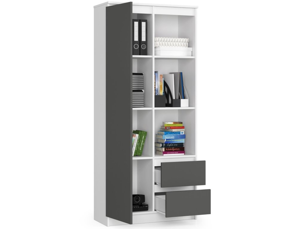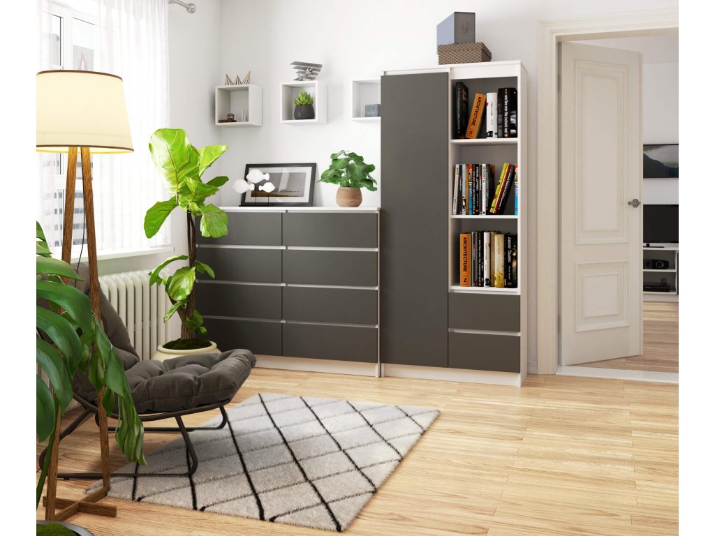 - Vybavení: Dvě zásuvky pro drobné předměty, skříňka s plnými dvířky a sedm prostorných polic pro vaše knihy a dekorace.