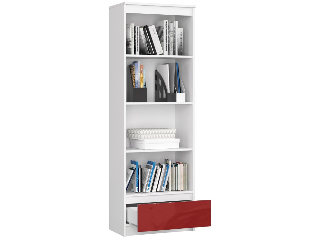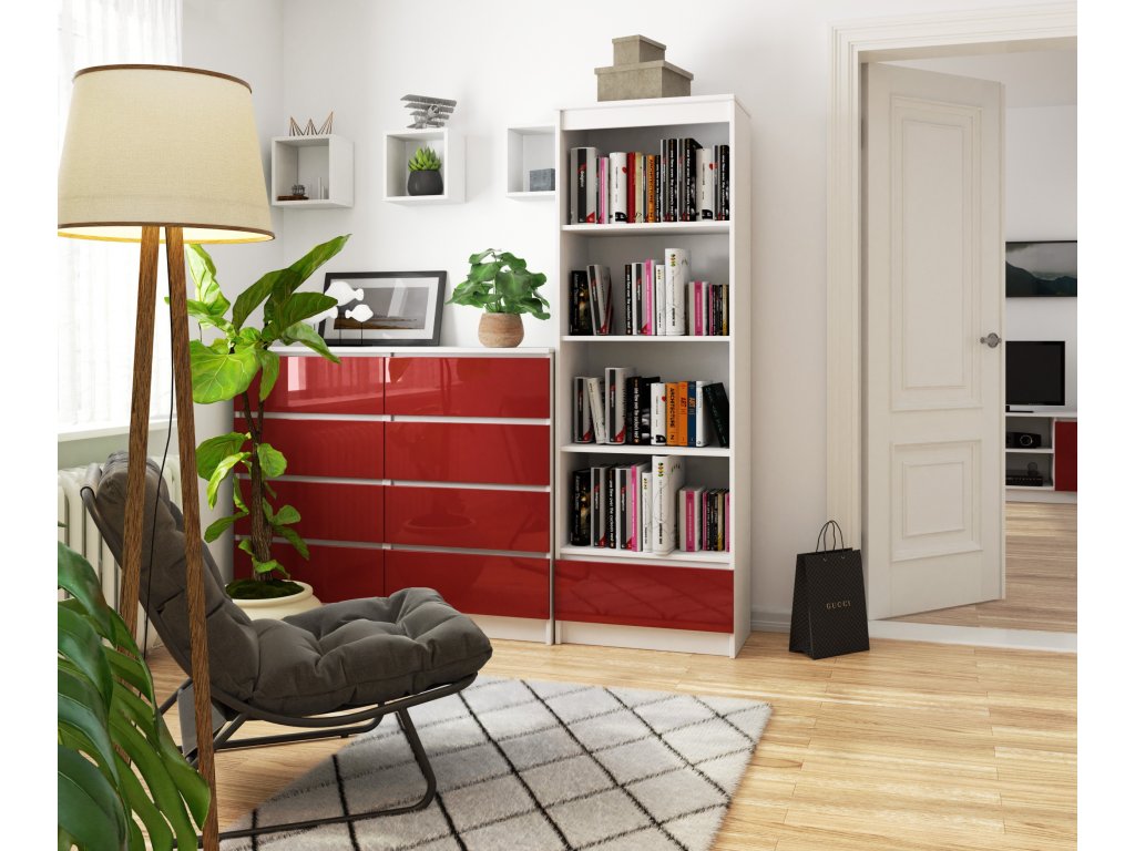 Regál THANE60 je synonymem pro kombinaci funkčnosti a výrazného designu. Červený lesklý dekor v kontrastu s bílou barvou dodává regálu jedinečný vzhled. Ideální pro obývací pokoj, kancelář či pracovnu.