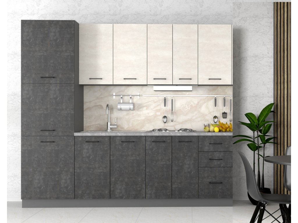 Stylová kuchyňská sestava RENATA 260 je efektivním a cenově dostupným řešením pro každou kuchyni. Rozměr 240 cm poskytuje dostatek úložného prostoru také díky praktické vysoké potravinové skříňce. Kuchyň je vyrobena z kvalitní LTD desky. Barevné provedení tmavý beton + světlý beton vytváří příjemný barevný kontrast s černými kovovými úchyty. Korpus kuchyně je v barvě grafit.