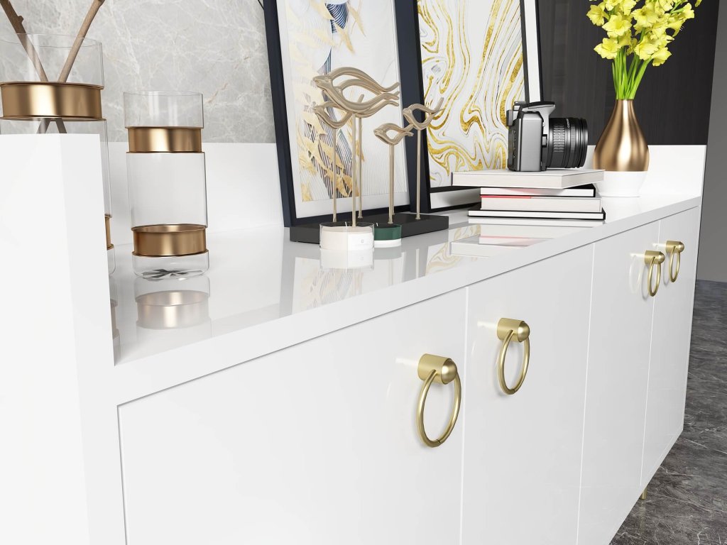 Skříňka RENO je dodávána v demontovaném stavu s přiloženým návodem na snadnou montáž. Plastové nožičky chrání podlahu před poškrábáním a zajišťují stabilitu. Tento elegantní a prostorný kus nábytku je perfektní volbou pro každý obývací pokoj, který hledá praktické a stylové úložné řešení.