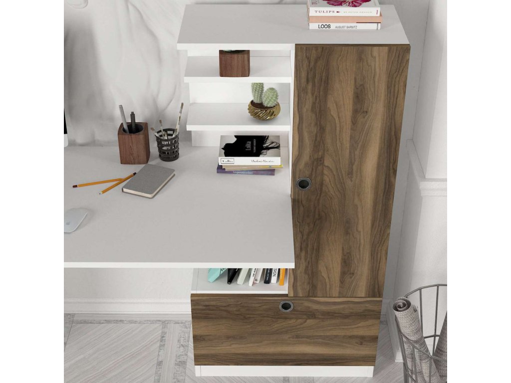 Stůl RHINOS je vyroben z kvalitního LTD materiálu s tloušťkou 18 mm, což zajišťuje jeho pevnost a dlouhou životnost. Elegantní kombinace bílé barvy a ořechu dodává stolu moderní a stylový vzhled, který se hodí do jakéhokoliv interiéru. Praktický regálek poskytuje dostatek úložného prostoru pro vaše pracovní potřeby a pomůcky.