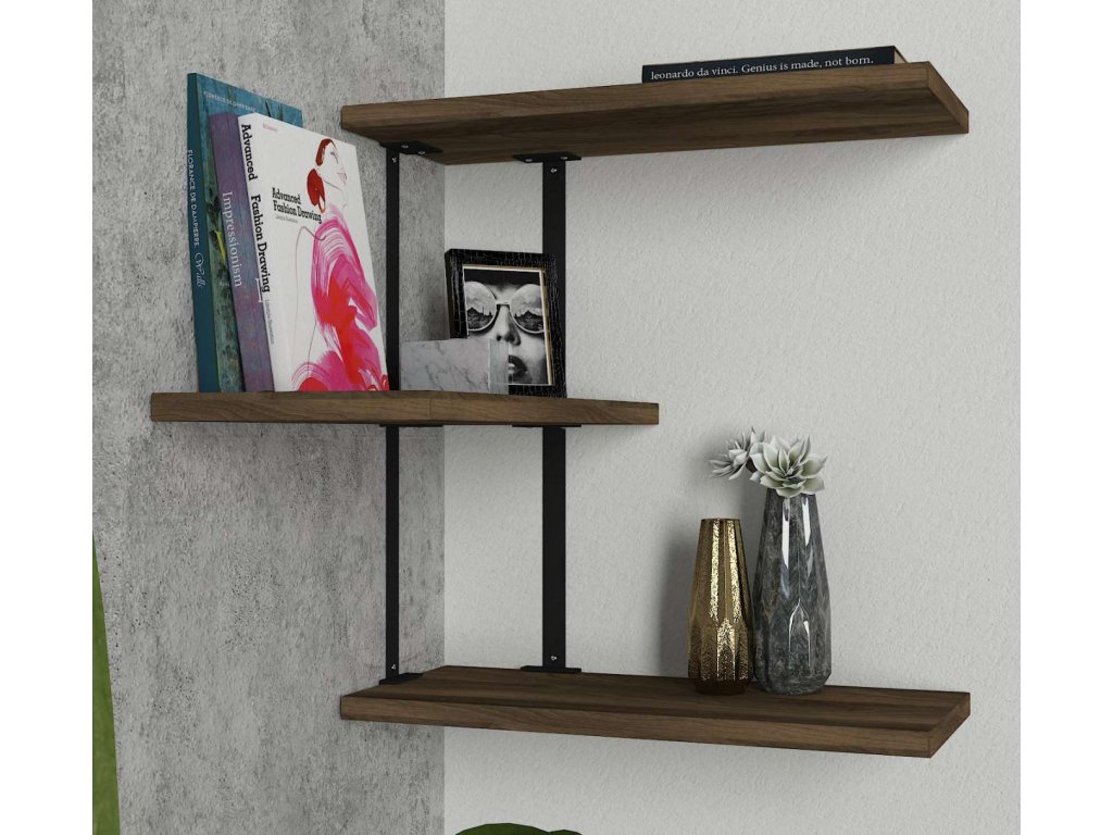 Nástěnná police RIBIS je vyrobena z kvalitního materiálu LTD s tloušťkou 18 mm, což zajišťuje její dlouhou životnost a odolnost. Její atypický tvar a elegantní design v barvě ořechu dodává každému interiéru moderní a industriální nádech. Tato police se perfektně hodí do obývacího pokoje i ložnice, kde poskytuje praktické a stylové řešení pro vystavení vašich oblíbených předmětů.