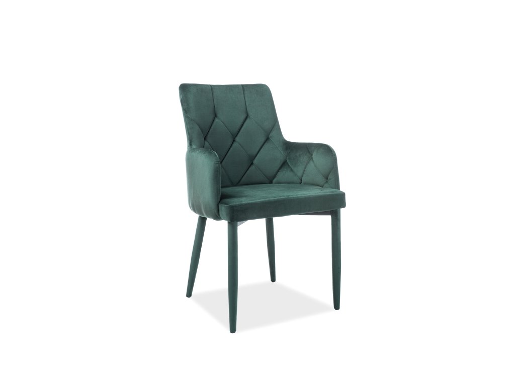 Elegantní čalouněná židle s područkami vhodná do kaváren, jídelen, restaurací, ale také do moderních domácností. Konstrukce židle je kovová ve stejném barevném provedení jako čalounění, sedák s opěrkou a područkami jsou očalouněny sametovou látkou zelené barvy, příjemné na dotek. Židle je v nabídce iv dalších atraktivních barvách. Židle dodává šmrnc ozdobné kosočtverečné prošívání zádové opěrky. Dodáváno v demontu. Rozměry židle: Celková výška židle: 88 cm Výška sedáku: 48 cm Hloubka židle: 44 cm Šířka židle: 50 cmDoplňkové parametry