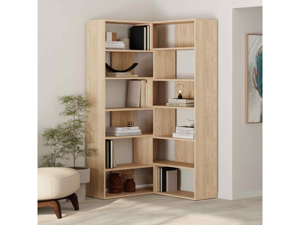 Udělejte svůj obývací pokoj ještě útulnějším s MAURICIO no.4. Tento rohový regál v přírodním odstínu dubu kombinuje praktičnost s moderním designem.