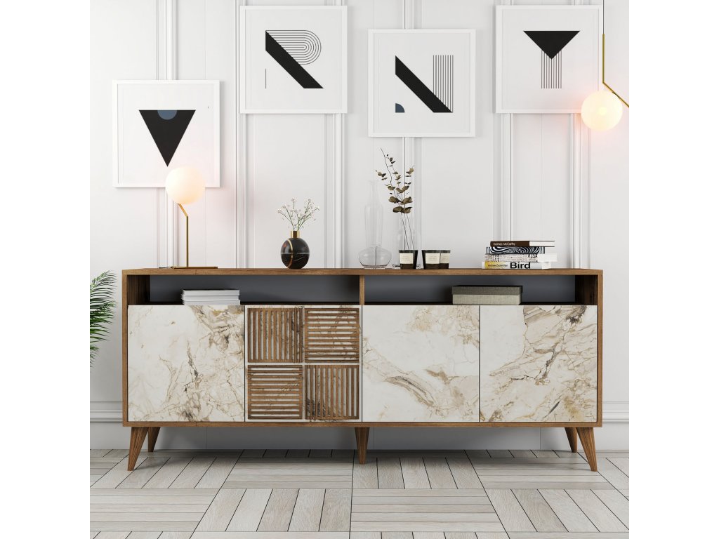 ROMA – Luxusní široká komoda s dekorem ořechu a bílého mramoru